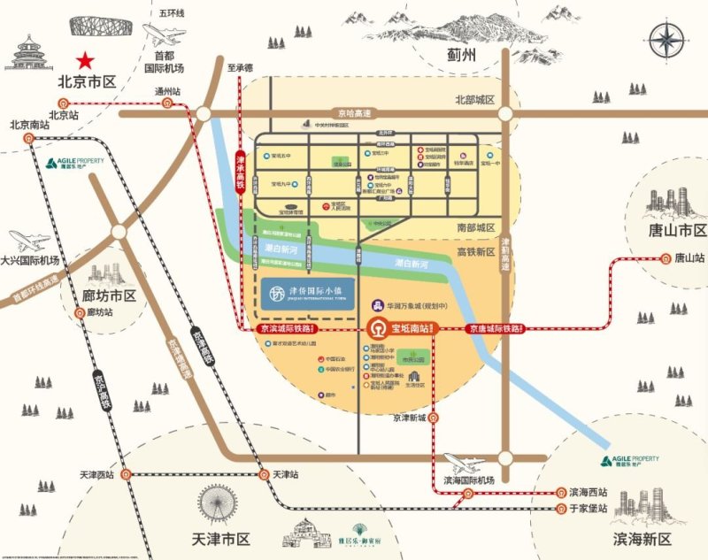随着高铁新城建设进程的提速,未来城市南移将带动人口的大流动。雅居乐·津侨国际小镇作为高铁新城的时代封面,是推动宝坻高铁经济发展的“排头兵”,更是打造展现宝坻城市形象的新窗口,发展重点;大量资源、配套、政策向此倾斜。本次首开产品更是地块内距离高铁站最近的产品,举步即达,未来京唐、京滨、津承三条城际线路交汇于此,宝坻将成为天津、北京、唐山三城经济区交汇中心点。不久的将来,从此至北京通州仅需18分钟,半小时内抵达天津市区、唐山、滨海新区。宝坻的跨越发展,触手可及,居于此的生活,即可享受京津冀城市圈生活的繁华与便利。