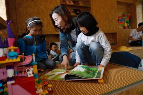 志愿者与学生在童趣园里共读绘本