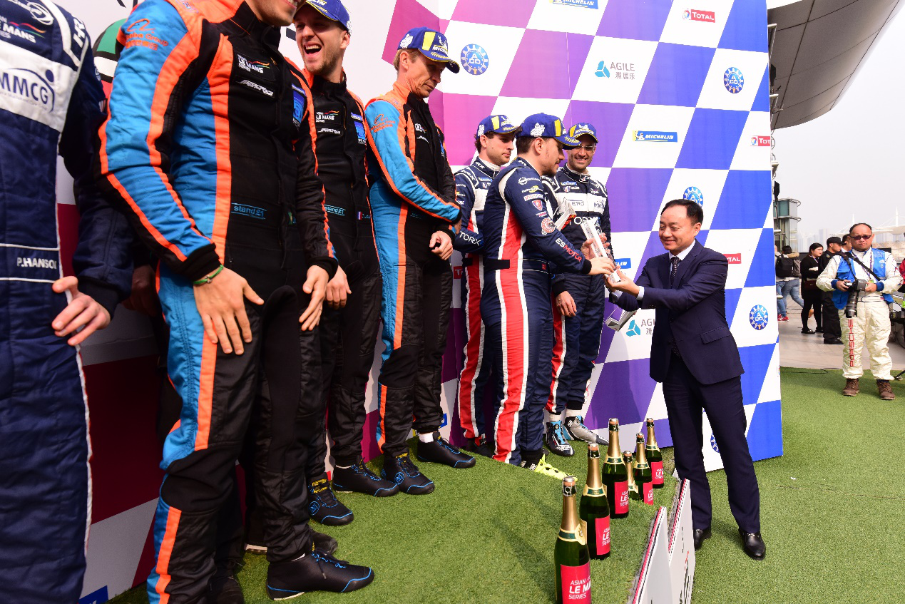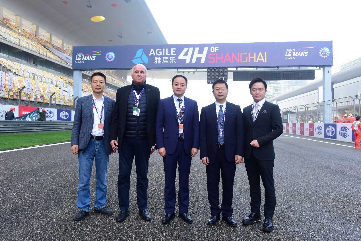 ??▲赛前合影 左起:亚洲(勒芒)汽车运动投 资基金管理有限公司 CEO 曹建伟、ACO(法国西方汽车俱乐部)主席特别顾问 Frederic Henry-Biabaud、雅居乐集团控股有限公司副总裁、地产集团总裁兼商业管理集团董事长 王海洋、上海力盛赛车文化股份有限公司董事长 夏青、雅居乐地产集团副总裁兼产城发展中心总经理 阮家声